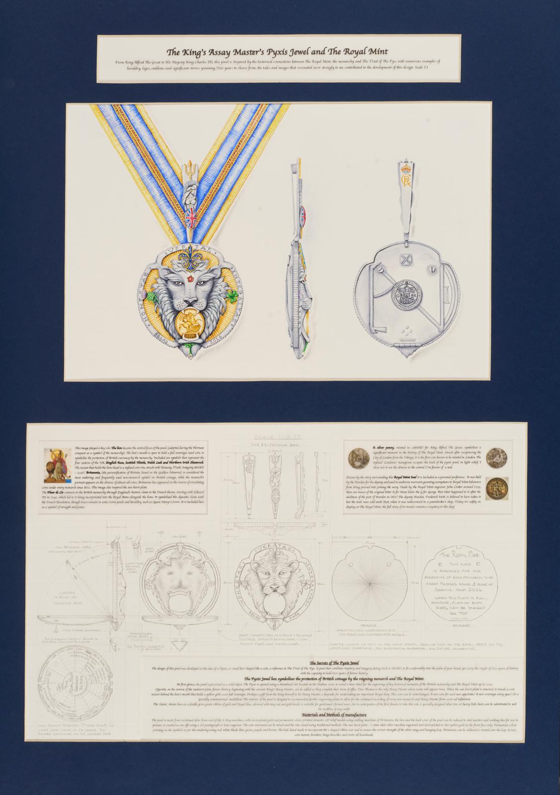 Below: Winning entry: “The King’s Assay Master’s Pyx Jewel and The Royal Mint” – hand-rendered jewellery design by Janet Weller, winner of the 2026 GC&DC 2D Hand Rendering Award.